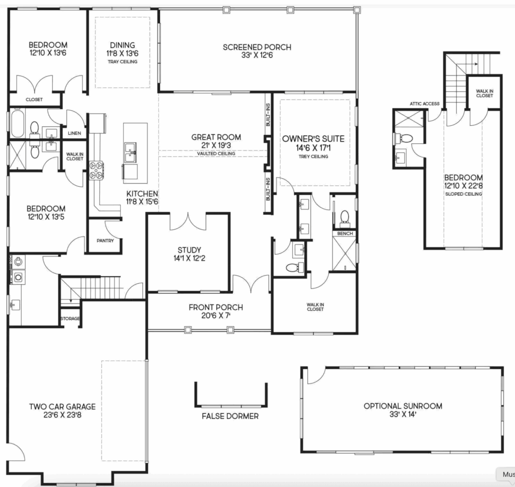 The Flagler floorplan by Kirk Pigford Homes, located in Faye’s Meadow at Mott’s Landing, provides 2,965 sq. ft. of well-designed living space featuring four bedrooms, 4.5 bathrooms, a study, and a two-car garage. The main floor centers around a spacious Great Room with vaulted ceilings, opening to a dining area and a kitchen with an island and pantry, ideal for family gatherings and entertaining. The Owner’s Suite offers a private retreat with a luxurious bathroom and walk-in closet. Two additional bedrooms on the main floor each have easy access to full bathrooms, providing comfort and privacy for family or guests. A dedicated study offers a quiet workspace at the front of the home.